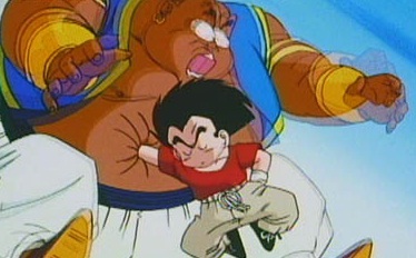 Una vez allí los niños se fusionan pero su fuerza parece insuficiente para ganar al monstruo, incluso cuando se convierten en Super Saiyajin. Muestran una gran variedad de técnicas curiosas como los Fantasmas kamikaze