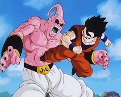 apenas logra tocar a Gohan, así que huye asustado. Mientras nuestros amigos buscan aDende y por el camino encuentran a Satán también. Una hora después Bu vuelve pero no desafía a Son Gohan sino a Gotenks. Los niños caen en la trampa y se fusionan. En ese momento Boo les absorbe a ellos y a Piccolo y se transforma en un ser de fuerza extraordinaria contra el que nada puede Son Gohan.