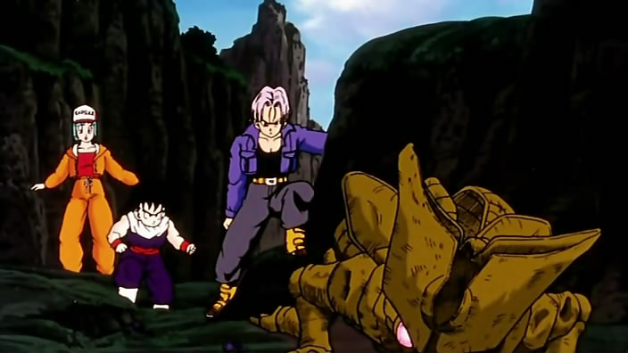 Gohan, Trunks del futuro y Bulma encontrando el cascarón de Cell.